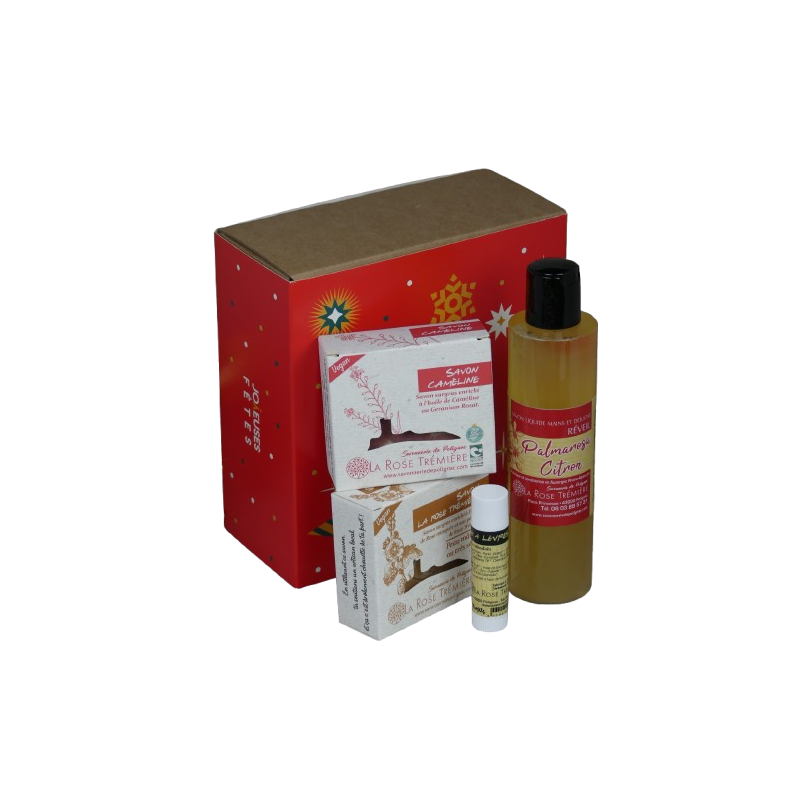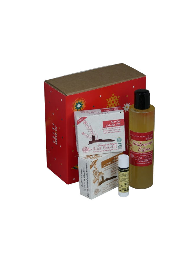 Une idée cadeau aux senteurs fraîches et variées. Deux savons surgras saponifiés à froid, un gel douche et un stick à lèvres satisferont tout public.
