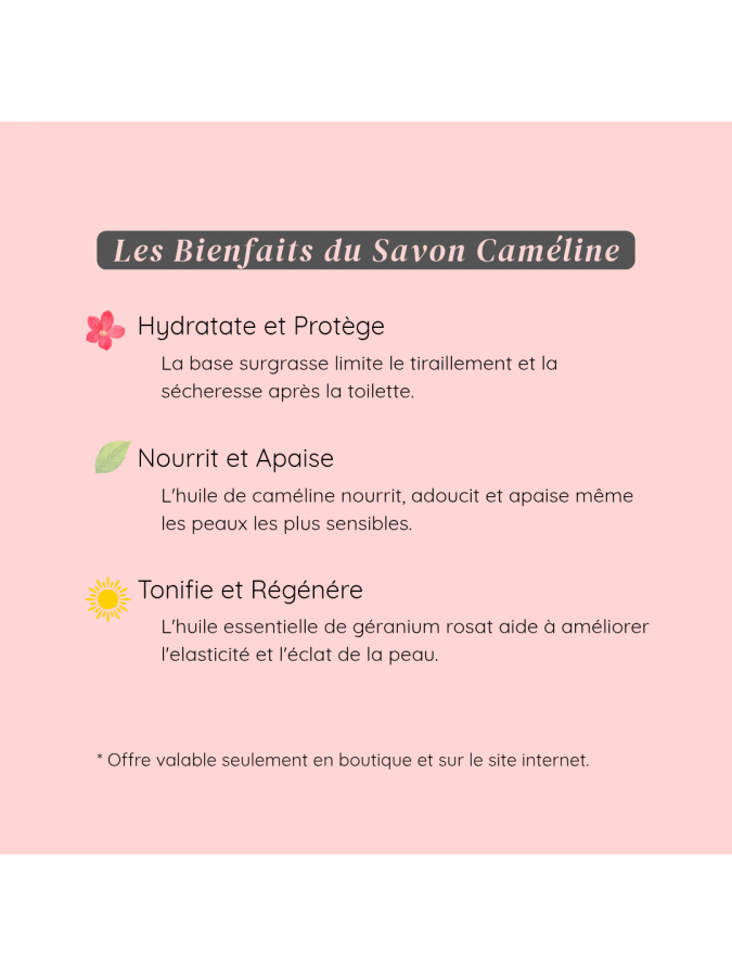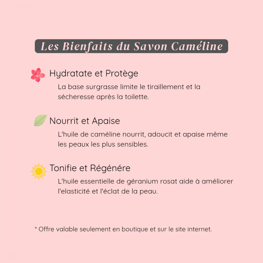 Notre savon surgras, enrichi à l'huile de caméline pour tous types de peaux notamment les peaux sèches, prendra soin de votre peau au quotidien!