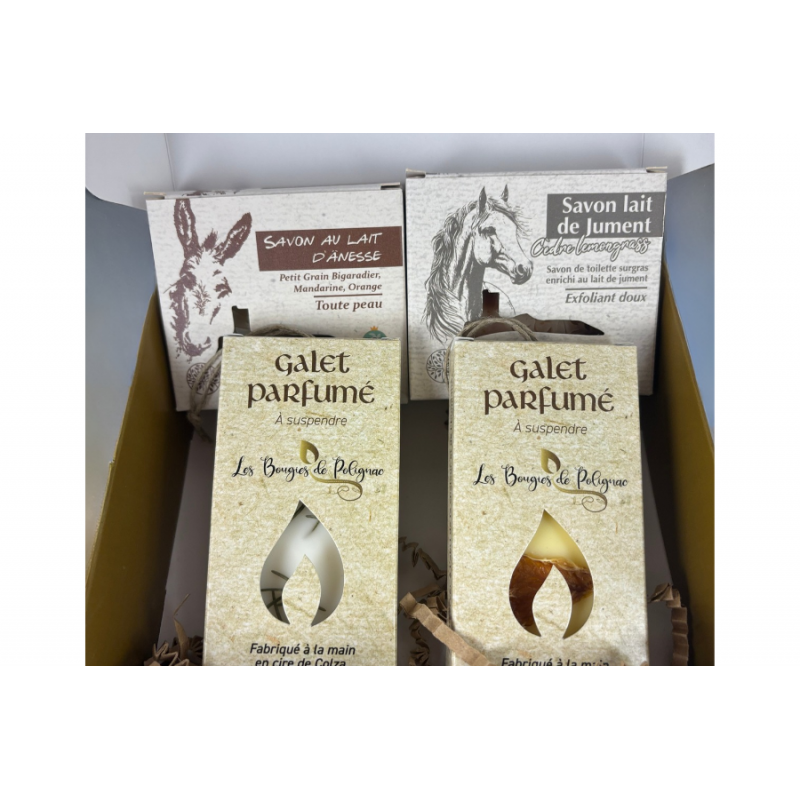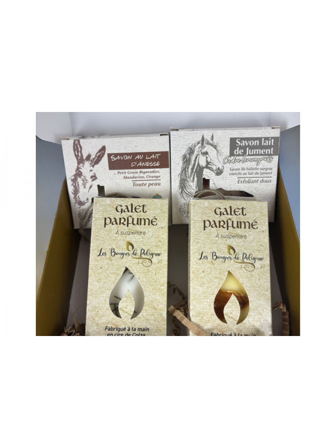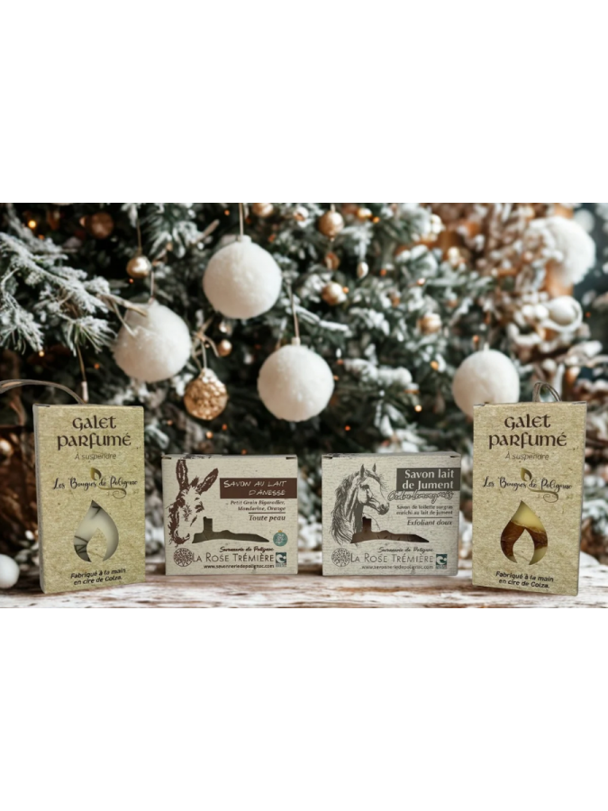 Offrez un Noël tout en douceur avec ce coffret artisanal composé de deux galets parfumés aux senteurs hivernales (orange & sapin) et de deux savons naturels 100 g au lait d’ânesse et de jument. Un cadeau parfumé, authentique et fabriqué avec soin pour sublimer les fêtes.