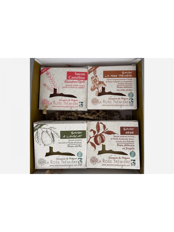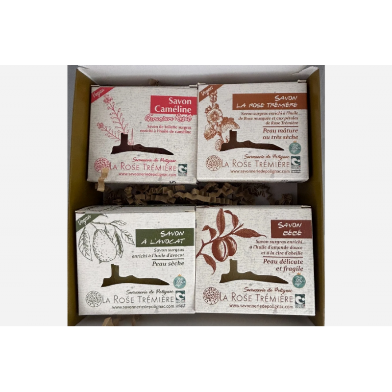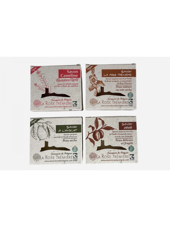Retrouvez quatre savons surgras de 100 g fabriqués artisanalement par saponification à froid formulés pour respecter toutes les peaux, même les plus délicates.