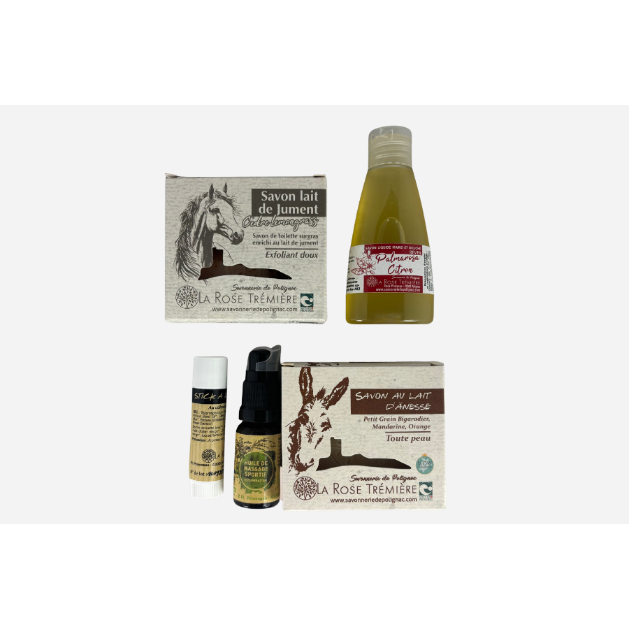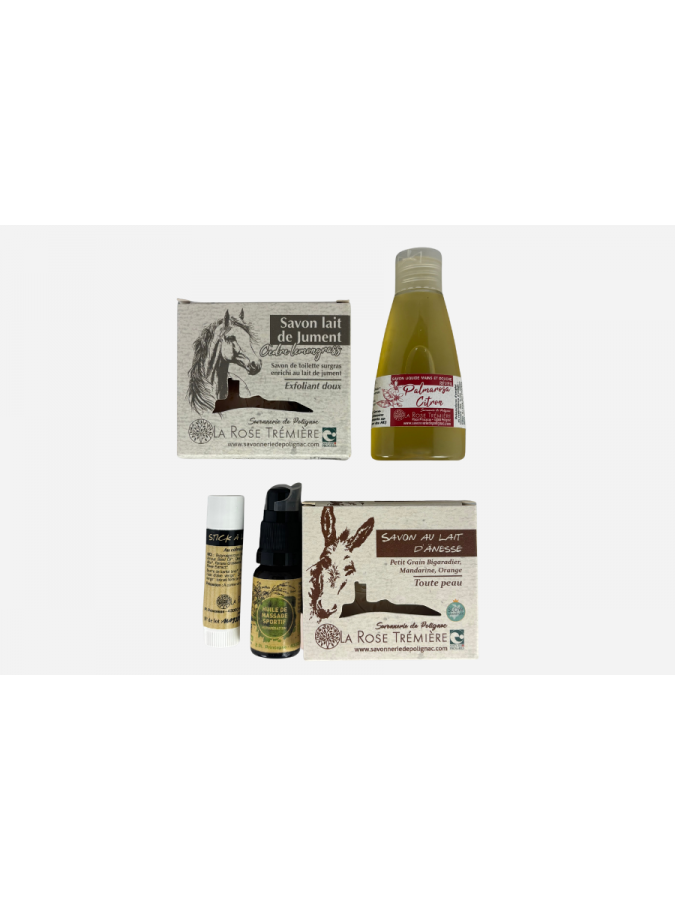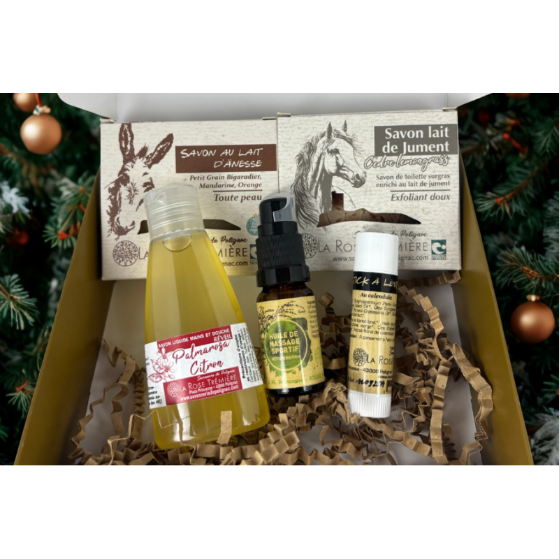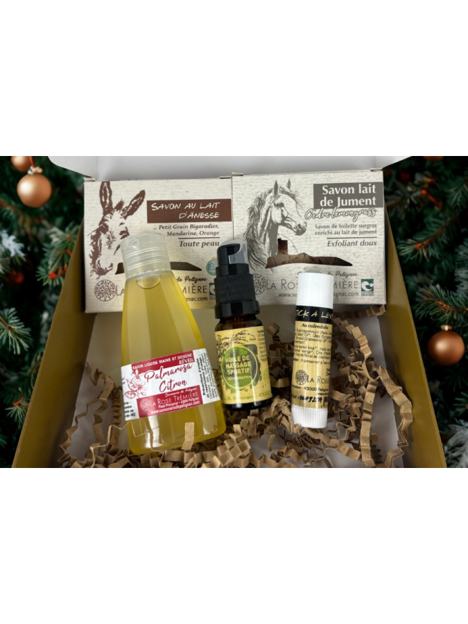 On vous propose un coffret varié pour prendre soin de tout le corps : un savon exfoliant doux au lait de jument, un savon au lait d’ânesse aux agrumes, un mini gel douche palmarosa/citron, une huile de massage récupération sportive et un stick à lèvres au calendula. Un cadeau complet idéal pour les fêtes !