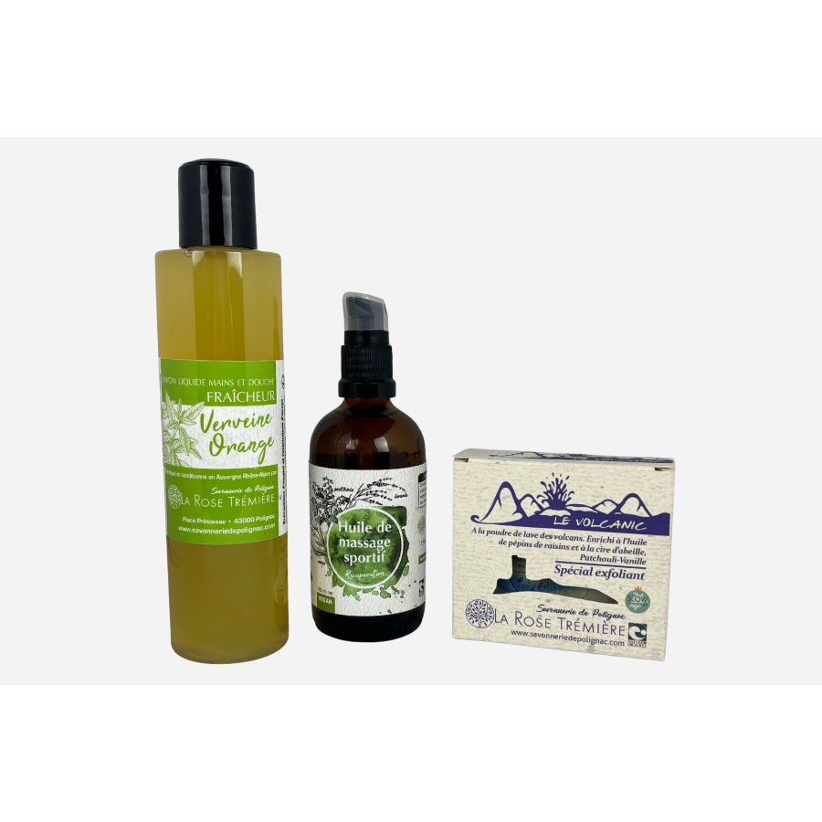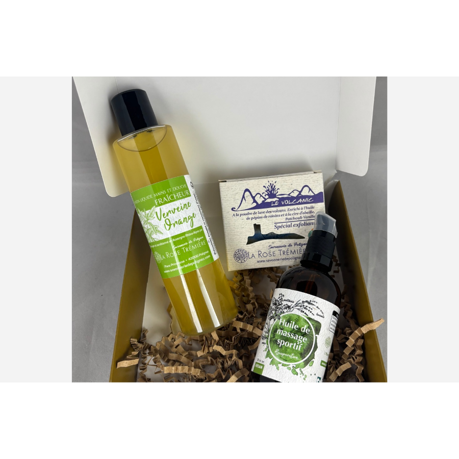Un coffret conçu pour les sportifs : huile de massage récupération sportive, savon exfoliant patchouli/vanille et gel douche “Fraîcheur” verveine/orange. Idéal pour détendre les muscles, exfolier la peau et retrouver tonus et vitalité.